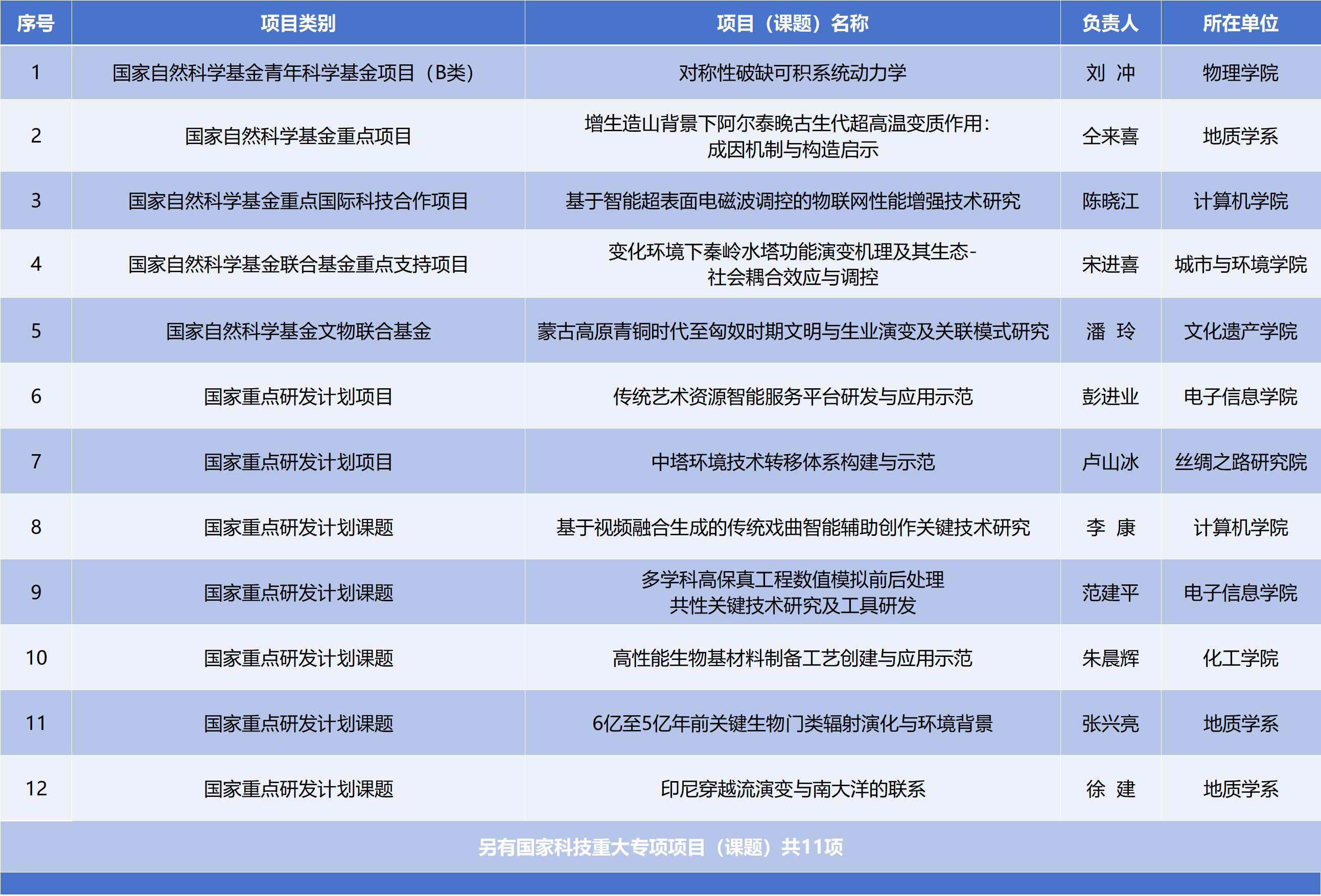 The university made a breakthrough in national key science and technology programs, securing for the first time a project under the reformed National Key R&D Program. The Department of Geology undertook 2 projects and 9 sub-projects. The School of Physics, Department of Geology, College of Computer Science, College of Urban and Environmental Sciences, and School of Cultural Heritage were approved for 5 talent-based and key projects under the National Natural Science Foundation of China, including the Young Scientists Fund (Category B), Key Program, Key International Cooperation Research Program, and Joint Fund Key Program. The School of Electronic Information, Institute of Silk Road Studies, College of Computer Science, School of Chemical Engineering, and Department of Geology secured 2 projects and 5 sub-projects under the National Key R&D Program. (Academic Affairs Office)