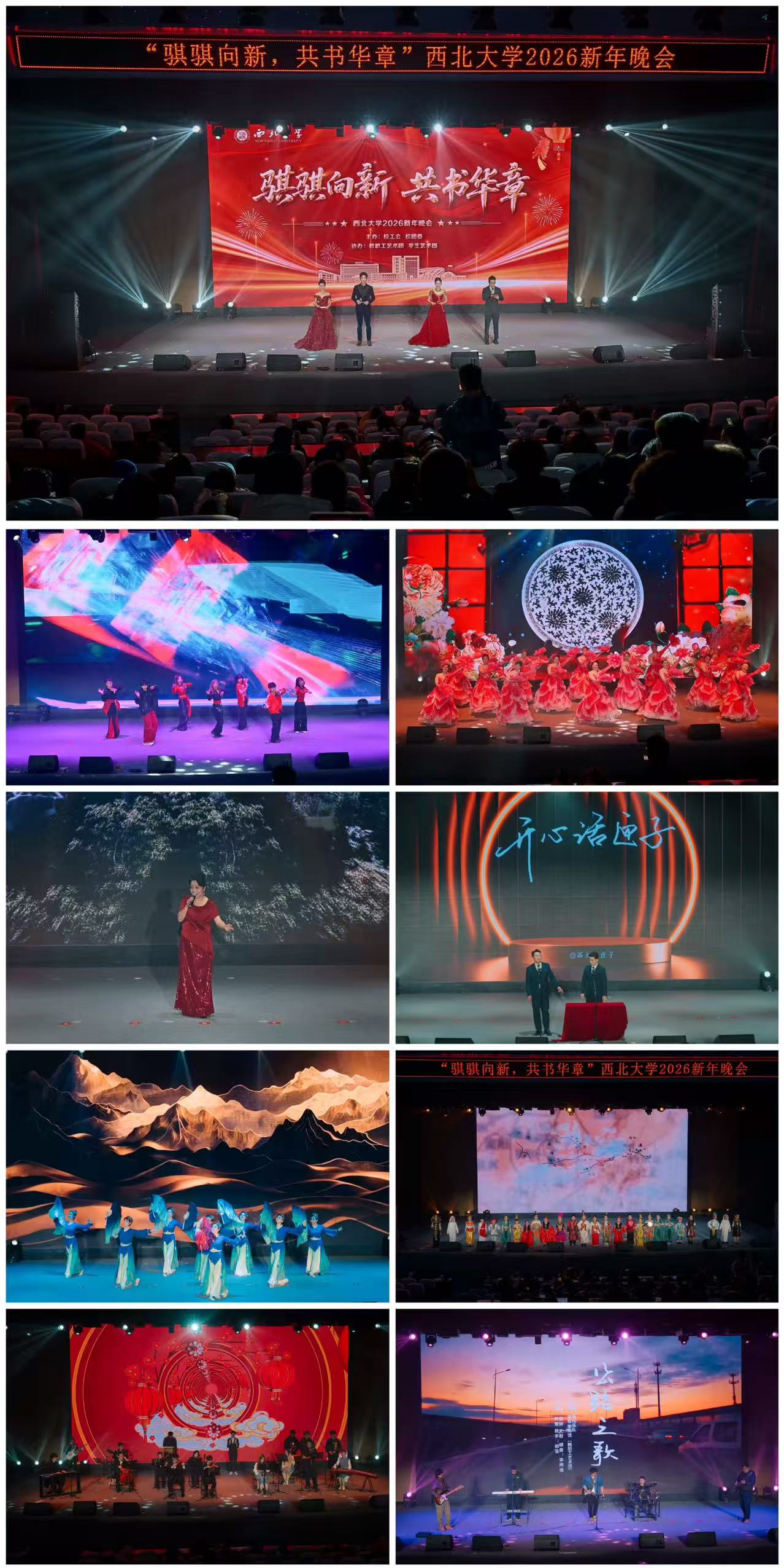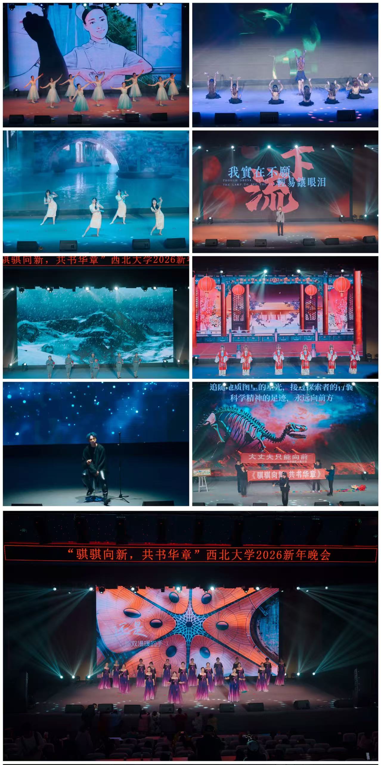 With spirited strides toward the new, jointly composing splendid chapters. On the evening of December 31, the university held the 2026 New Year’s Gala at the Chang’an Campus. Teachers, students, and their families gathered together, bidding farewell to the old year and welcoming the new one amidst wonderful performances including singing, dancing, cross-talk, and traditional Chinese opera. Xiao Daoyuan, Deputy Party Secretary and Secretary of the Discipline Inspection Commission of NWU, and Head of the Provincial Commission for Discipline Inspection and Supervision Stationed at the University, attended the gala. The gala commenced with an opening dance jointly performed by the Staff Art Troupe and the Student Art Troupe, followed by programs such as Ode to the Coral, A Great River, and Mount Loushan. The grand finale, The Tale of Dinosaurs, was jointly performed by the great-granddaughter and niece of our university’s former President, Mr. Yang Zhongjian, the pioneer and founder of Chinese vertebrate paleontology. Through an impassioned speech and magical illusion techniques, the performance vividly recreated Mr. Yang Zhongjian’s spirit of scientific exploration and his outstanding achievements. The gala also featured a lucky draw segment, where ten fortunate audience members took the stage to share their New Year’s wishes for the university, their families, and themselves. (Labor Union Committee, Northwest University)